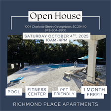 Richmond Place Apartments in Georgetown is hosting an openhouse and you are invited! Check out the lovely Grounds, beautiful Apartment Homes, Clubhouse, Fitness Center and Pool and Enjoy refreshments and snacks. Richmond Place Apartments is now offering 1 month free to all new applicants, for any size floorplan from one bedroom to 3 bedrooms apartment homes - and, for a limited time only, we are also adding a $200 gift card if you apply and are approved! We look forward to seeing you there!